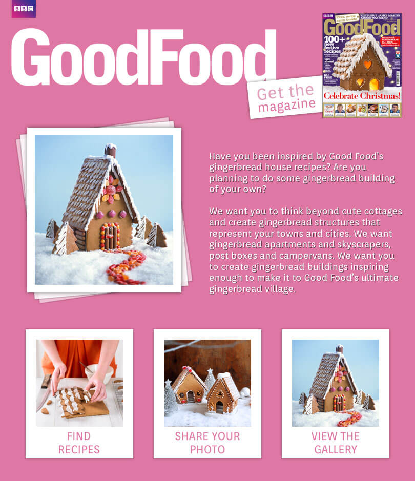 To celebrate Christmas 2012, they wanted a Facebook app, allowing users to upload photos of their gingerbread creations and be entered into a competition to have their creations recreated by the Good Food cookery team, professionally photographed and featured on the BBC Good Food website.
