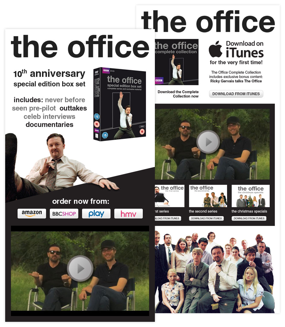 I built two Facebook apps; one dedicated to the release of the 10th anniversary box set, the other dedicated to The Office on iTunes. Each app featured an exclusive video message from Ricky Gervais and Stephen Merchant.