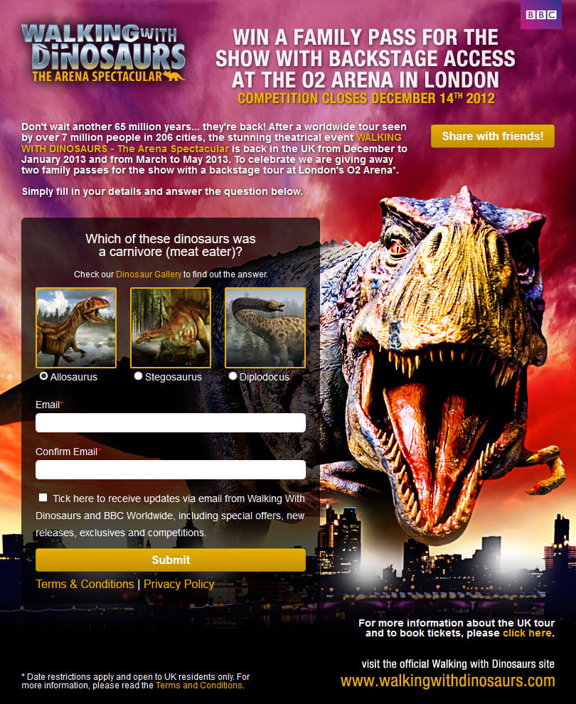 The app incorporated data capture as well as a "Like gate", requiring users to Like the Facebook Page before entering the competition, therefore increasing the Walking with Dinosaurs Facebook audience.